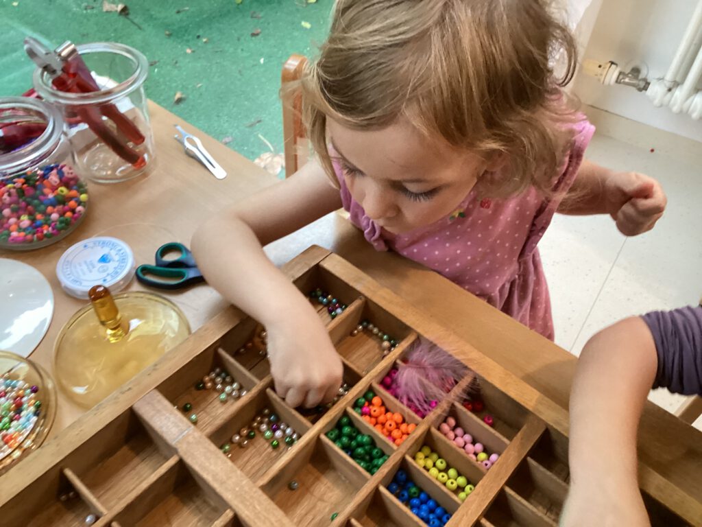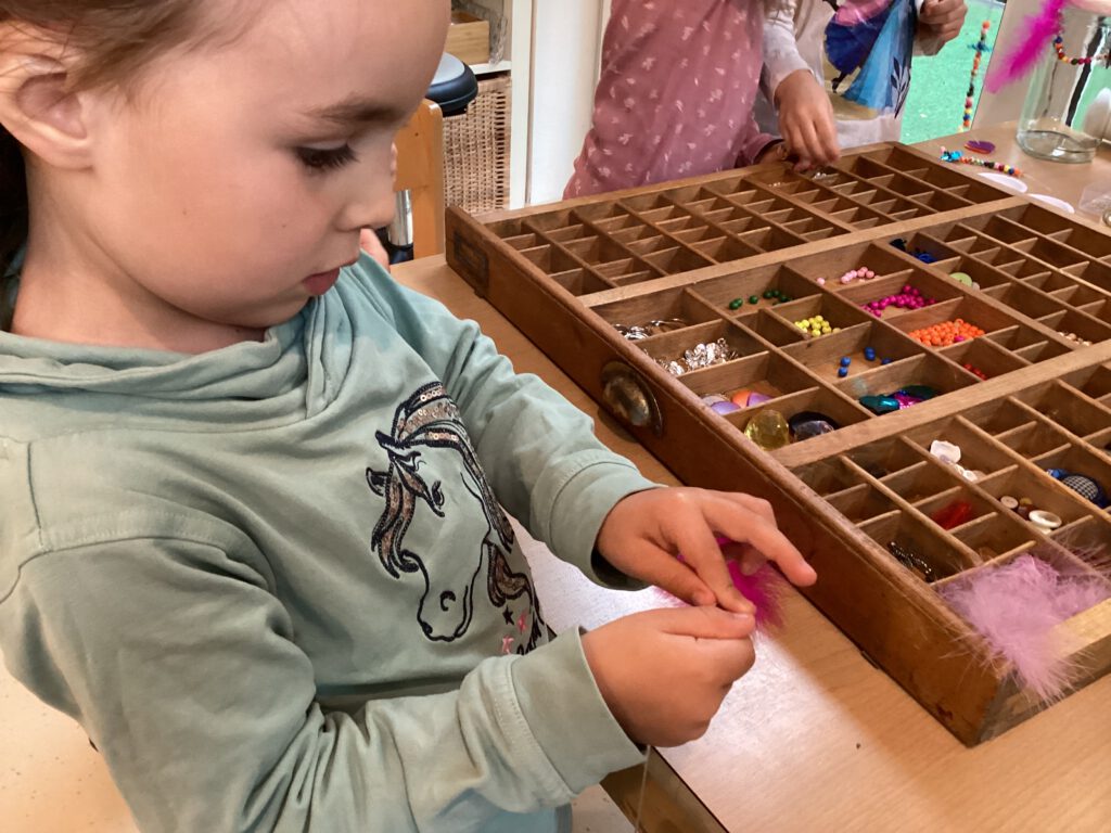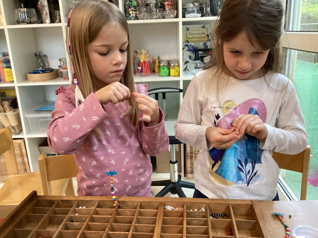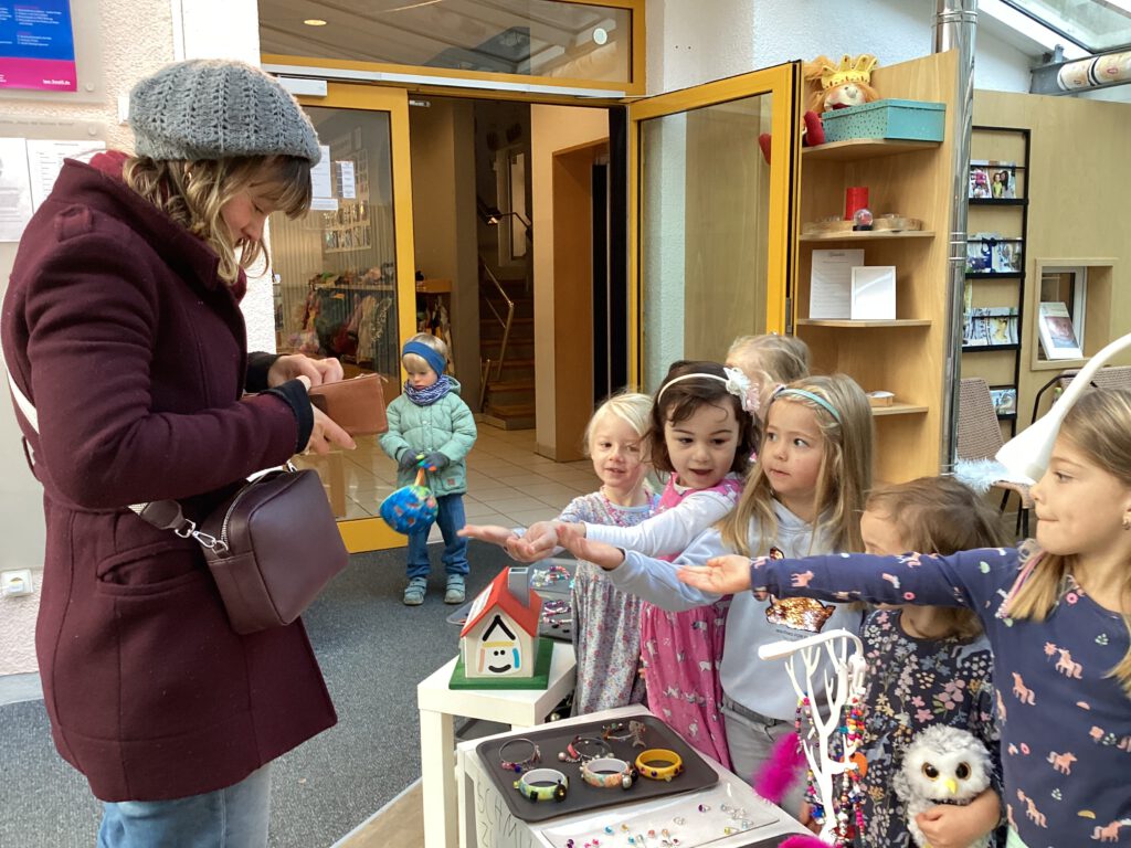 Die Kinder im Atelier fädeln viele Tage hintereinander Holzperlen auf und lassen Perlenketten und Schlüsselanhänger entstehen. “Haben wir auch echte Perlen?” frägt Lotta. Die Pädagogin verneint. Daraufhin überlegen wir gemeinsam, wo es echte Perlen gibt. “Meine Oma hat eine Perlenkette, die kann ich mal mitbringen!”, sagt Anneli. “Wie wär’s wenn wir alle Perlen mitbringen und dann Schmuck machen?”, schlägt Pia vor. Gesagt, getan. Nach einem Rundbrief an die Eltern trudelt so viel Modeschmuck ein, dass die Kinder ihre eigene Schmuckwerkstatt gründen können. Wir “zerlegen” den alten Schmuck und machen daraus einen neuen. Die Kinder sind viele Tage am werkeln und basteln. Es entstehen neue Ohrringe, Armreifen, Schlüsselanhänger, Ketten, Ringe und vieles mehr. “Den Schmuck könnten wir ja verkaufen oder?”, frägt Anneli. Ein großer Verkaufstand wird eröffnet.